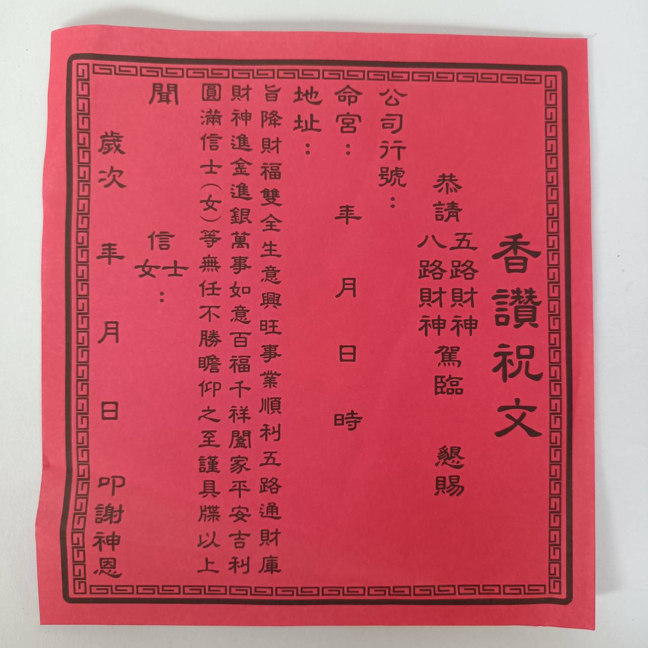 內容物:疏文、招財開運補庫符令、發財錢、補運錢、財神錢、天庫、八路財神專用發財金