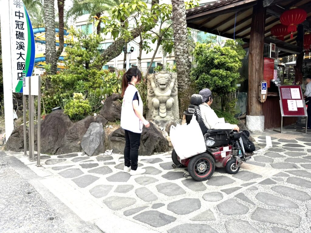 訪視人員針對無障礙友善環境包含標示指引、升降設備、身障停車位、無障礙廁所扶手、警示鈴等基礎設施實施盤點,均能符合身心障礙者的使用需求,其中頭城休閒農場(如下圖照片)無障礙坡道、扶手、廁所等設施設備現況良好,諾大寬敞的園區,以輔具移動便利性為考量增設無障礙設施,規劃友善行進路線,並有輪椅租借服務,為身心障礙及年長者提供舒適安心的旅遊空間。
