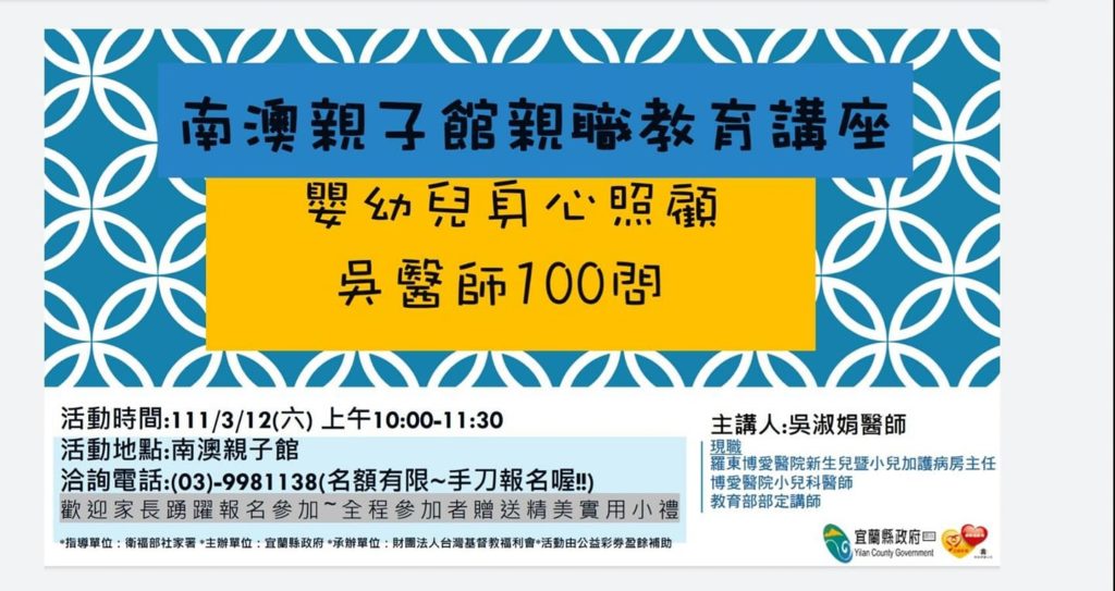 活動分享預告:3/12(六)親職講座嬰幼兒身心照顧-吳醫師100問機會難得,名額有限,手刀報名👉南澳親子館專線
